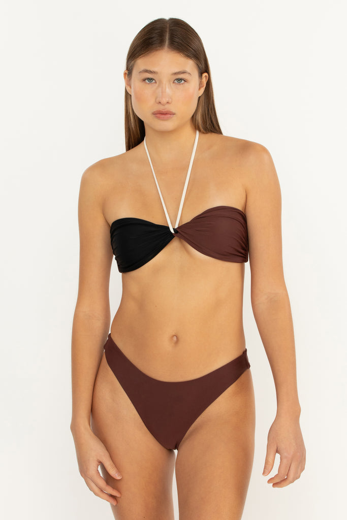 Meet Claude, a fresh twist on the classic bandeau, designed with bold, multi-color paneling. Clean and strapless with a nostalgic edge, Claude brings a playful yet refined energy to your vacation edit. Pair with the Skye Bottom for a sleek, sun-ready set.