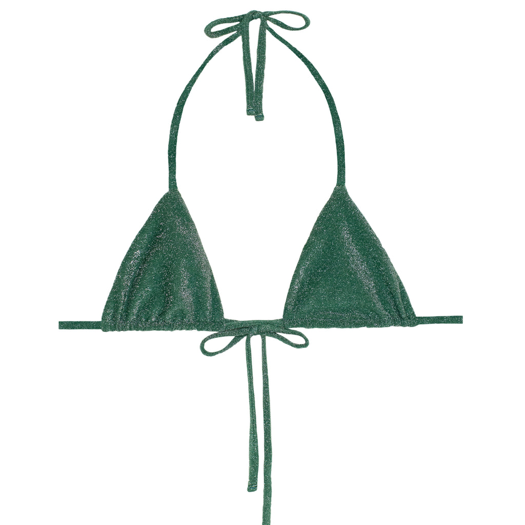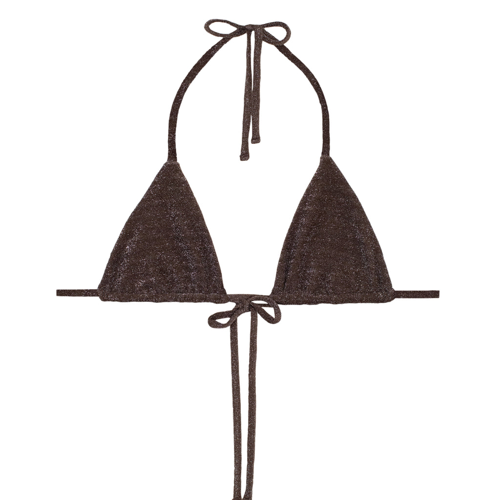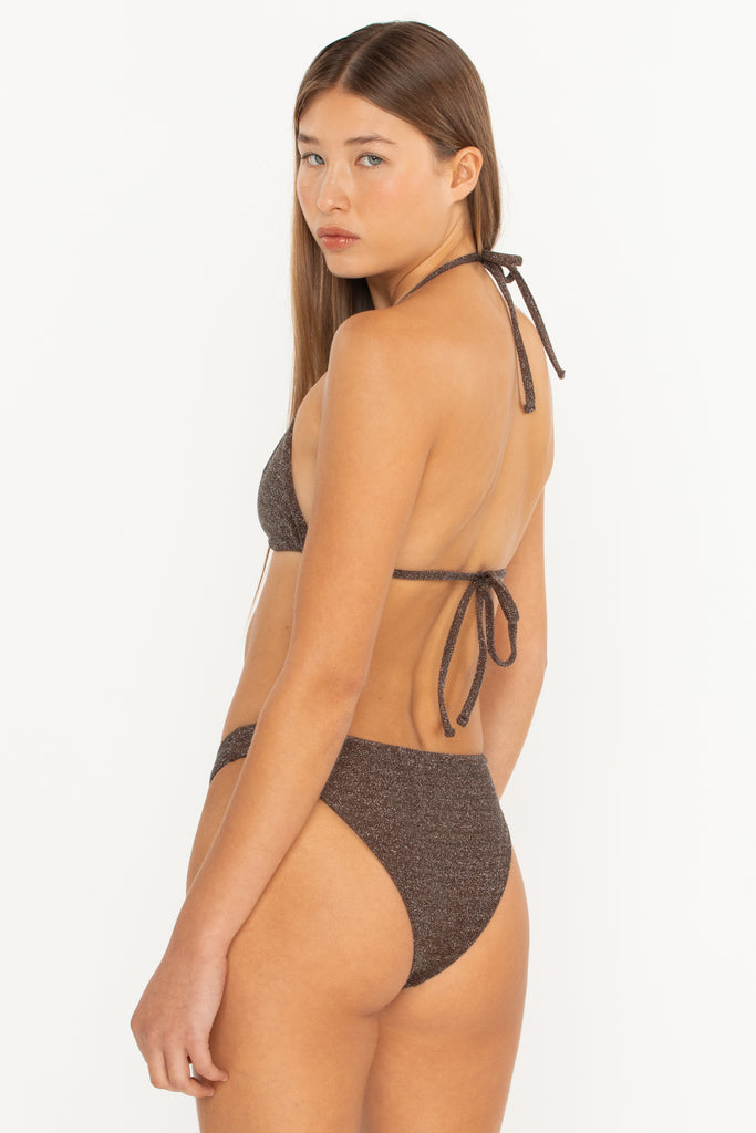 The Ischia Top is our most minimal coverage bikini top with its thin, barely-there straps and halter neck. Now available in MIKOH’s signature Lurex fabrication, best paired with the Lurex Papara Bottom for a complete, shimmery swim edit.