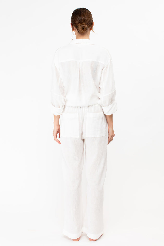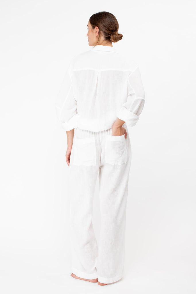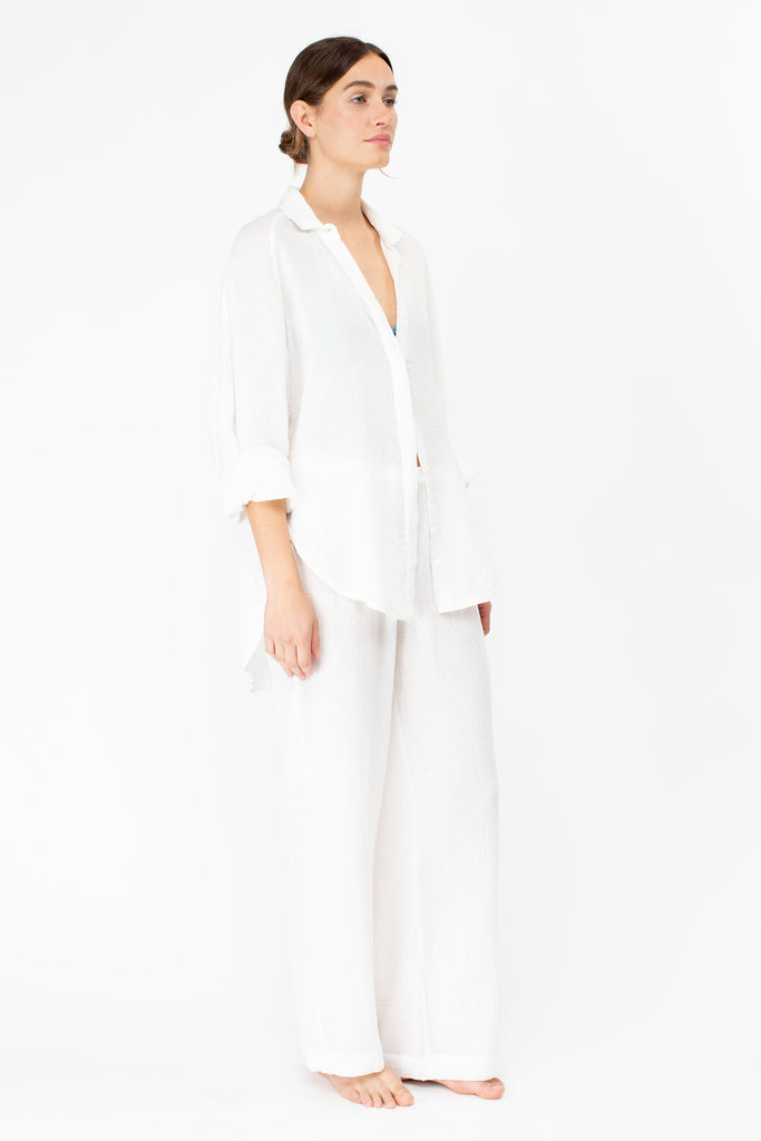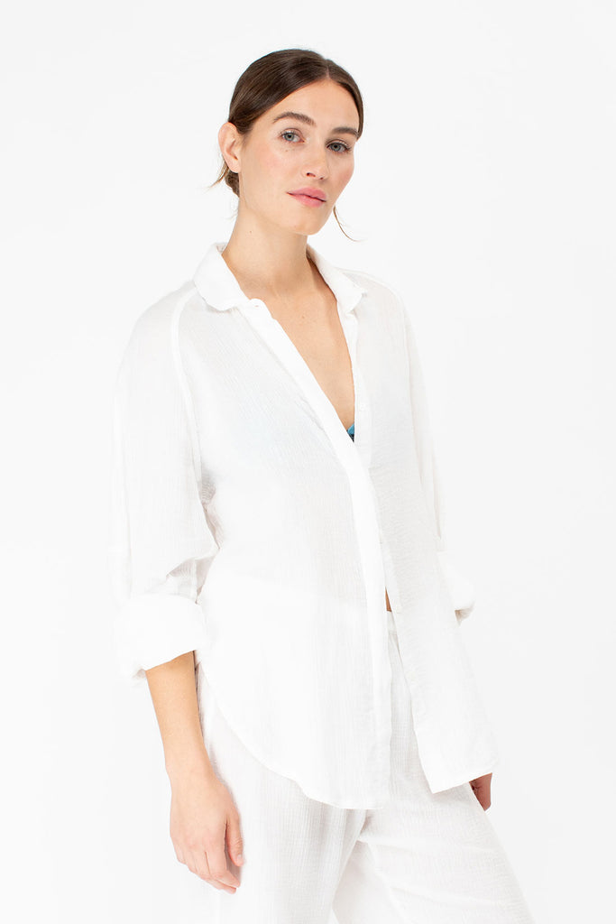 The Noto button-up shirt is crafted in ultra soft cotton and can be styled with effortless ease. We are coining this as our "beach button up". With a slight oversized fit and roomier sleeves, the Noto Shirt can be throw over your favorite MIKOH bikini or paired with her matching Reyna Shorts to complete the co-ord look.