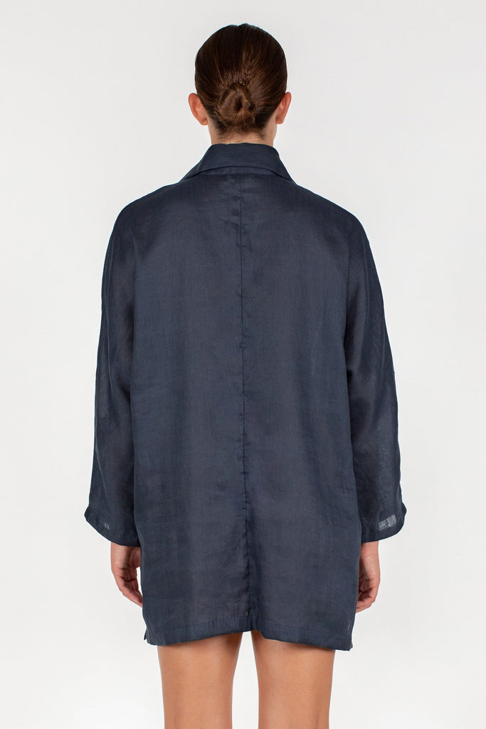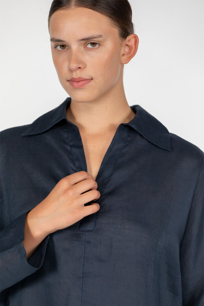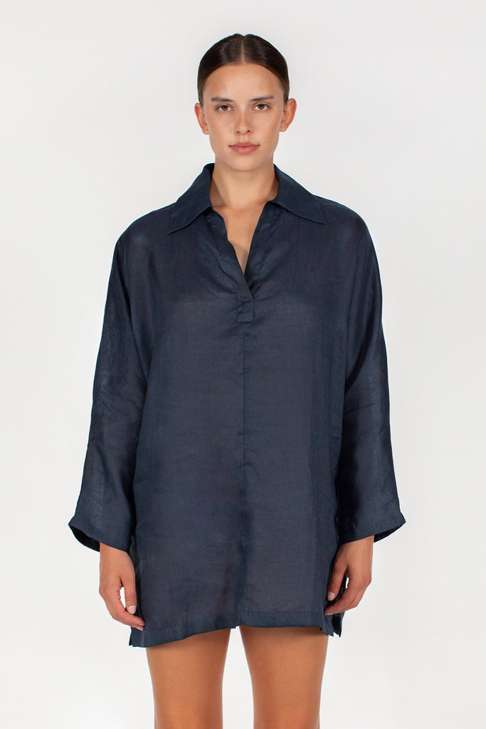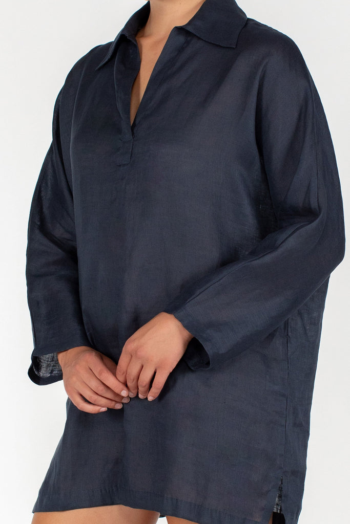 The Evie is a classic linen kaftan that will remain a staple in our closets for seasons to come. This uncomplicated, easy to throw on piece is a warm weather mainstay. Featuring a v neck, collar, and long sleeves. Picture yourself wearing this with your strappiest sandal and widest brim hat on your next Holiday.