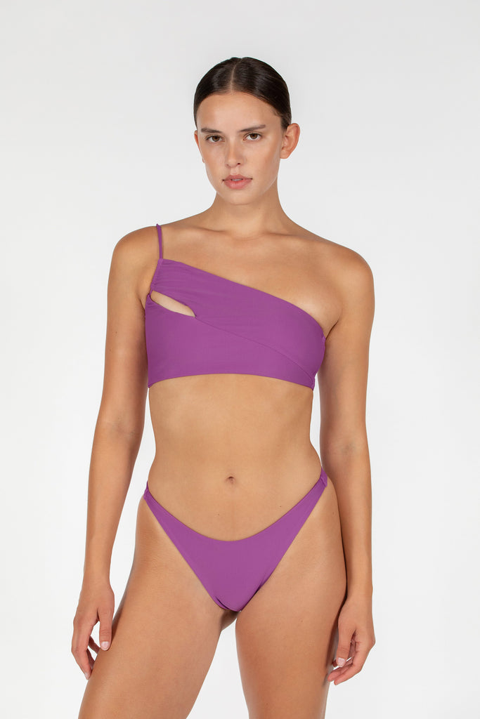 The Nelle top features a sleek thin strap and a chic keyhole cutout in the front, this asymmetrical design blends modern style with minimalism. Perfect for poolside lounging or beach adventures, it’s a statement piece for your swimwear wardrobe.