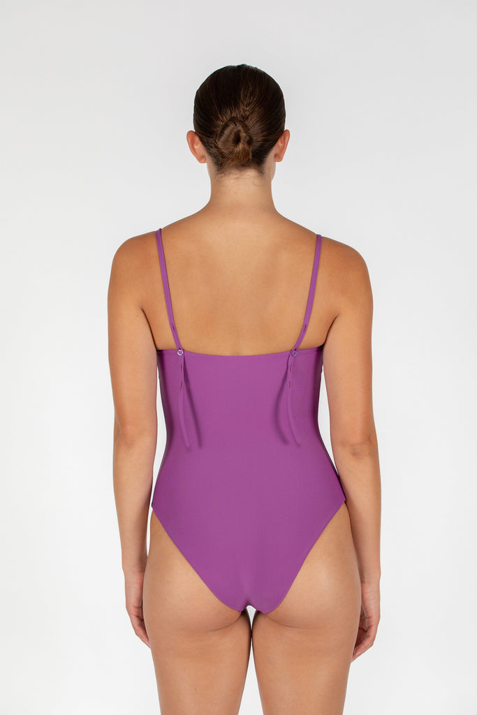 The Wren is the one piece version of our new Spence top. Featuring a flattering square neckline with three buttons up the front, this sleek design offers moderate coverage and adjustable ties at the back for a customizable fit. A chic and versatile piece perfect for lounging by the water.