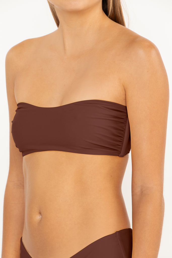 The Loki bandeau features minimal coverage and a sleek, strapless design. This chic bikini top is perfect for sunbathing or layering under breezy summer linen. A go-to for those who love modern, minimalist swimwear.